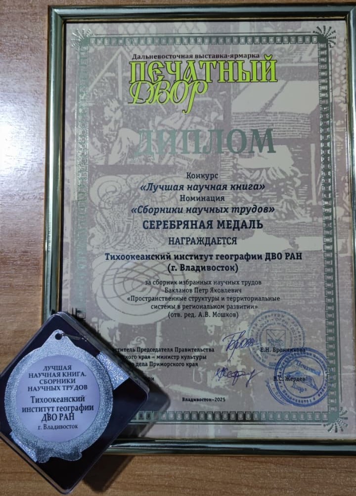 По традиции, во время проведения выставки «Печатный двор» состоялось награждение победителей конкурсов «Лучшая научная книга», «Лучшая учебная книга», «Лучшее краеведческое издание», «Лучшее электронное издание», «Лучшее полиграфическое исполнение», а также Премией имени Матвеевых. Тихоокеанский институт географии ДВО РАН в этом году был награжден серебряной медалью в конкурсе «Лучшая научная книга» в номинации «Сборники научных трудов» за сборник избранных научных трудов Бакланов П. Я. «Пространственные структуры и территориальные системы в региональном развитии», а Камчатский филиал ТИГ ДВО РАН, в этой же номинации, был удостоен дипломом за материалы XXV научной конференции, посвященной 130-летию со дня рождения Г.У. Линдберга «Сохранение биоразнообразия Камчатки и прилегающих морей».