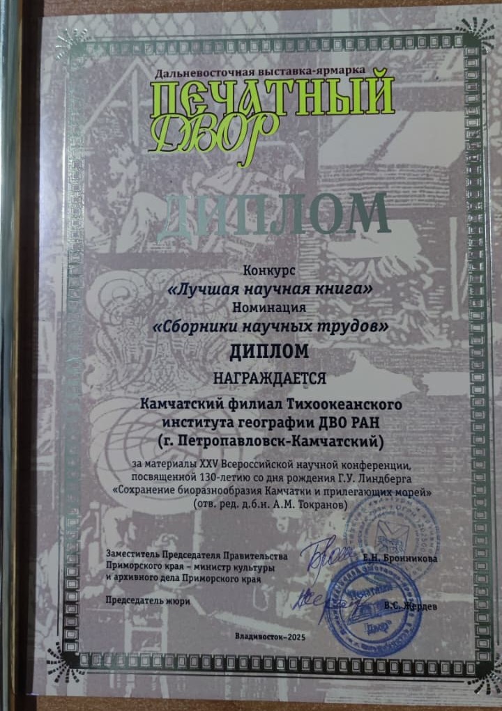 По традиции, во время проведения выставки «Печатный двор» состоялось награждение победителей конкурсов «Лучшая научная книга», «Лучшая учебная книга», «Лучшее краеведческое издание», «Лучшее электронное издание», «Лучшее полиграфическое исполнение», а также Премией имени Матвеевых. Тихоокеанский институт географии ДВО РАН в этом году был награжден серебряной медалью в конкурсе «Лучшая научная книга» в номинации «Сборники научных трудов» за сборник избранных научных трудов Бакланов П. Я. «Пространственные структуры и территориальные системы в региональном развитии», а Камчатский филиал ТИГ ДВО РАН, в этой же номинации, был удостоен дипломом за материалы XXV научной конференции, посвященной 130-летию со дня рождения Г.У. Линдберга «Сохранение биоразнообразия Камчатки и прилегающих морей».
